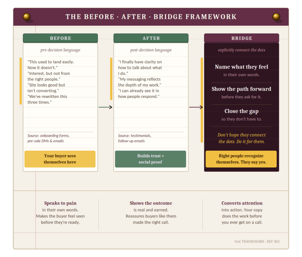 Here’s what this might look like applied directly to copy using the Before, After, and Bridge pulled straight from the VoC patterns above: