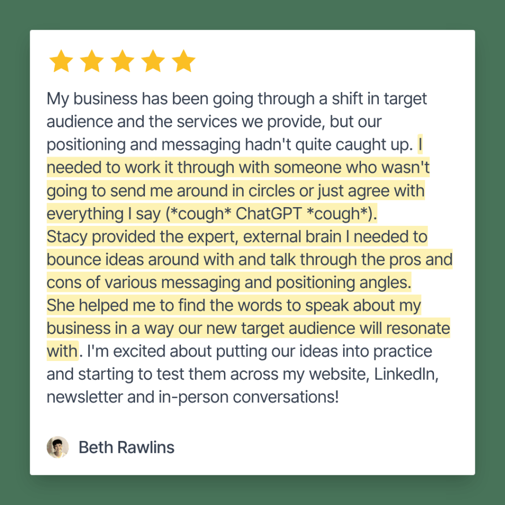 Before booking with Stacy, I was so lost when trying to figure out what differentiators I should focus on, and how to even begin communicating them. After our strategy session, I left with so much clarity and actionable next steps. I saved so much time and SO many headaches by just booking a strategy call.”