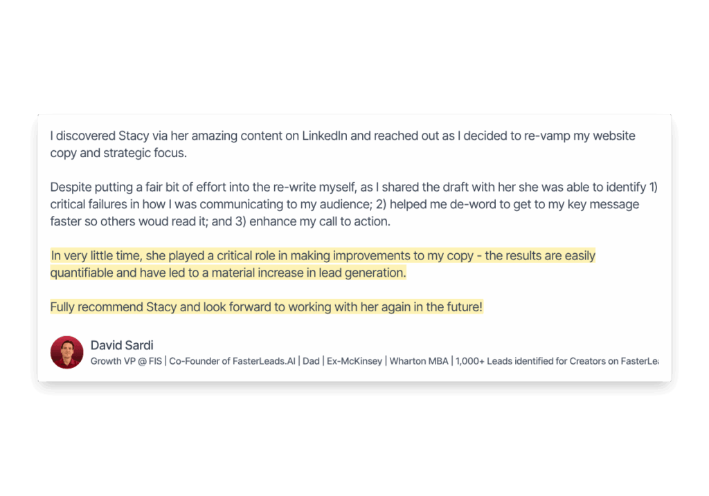 3. Copy audit: Get a fresh set of eyes on your website, sales page, or key asset. You’ll walk away with a prioritized roadmap of what to fix first and how to fix it.